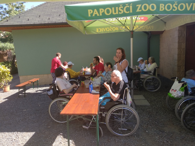 Každý dobrovolník byl doprovodem (i DOBROvodem) jednoho seniora na invalidním vozíčku. Společně jsme si prohlédli voliéry s asi 200 druhy papoušků a obdivovali krásu jejich barev, jak jsou velicí či naopak jak jsou maličcí, a rozhodně nepřeslechli sílu jejich společného „povídání“. K obědu nám Domov sbalil každému řízek, a pak jsme si dali „něco dobrého“ v místní kavárničce: kávičku, zmrzlinku nebo nějaké jiné potěšení. Společný čas strávily skupinky či dvojice povídáním a sdílením svých životních příběhů.