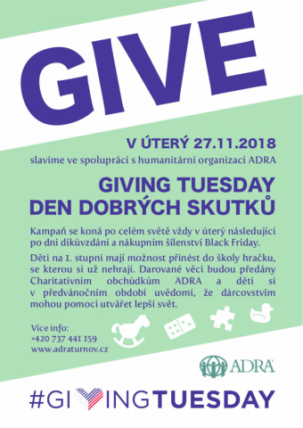 V úterý 27.11.2018 proběhne na vybraných školách v libereckém kraji ve spolupráci s humanitární organizací ADRA Giving Tuesday - Den dobrých skutků. Děti budou moci přinést hračku, stolní hru nebo knížku, kterou už nepotřebují a darují ji pro účely Charitativních obchůdků ADRA.Výtěžek z prodeje bude věnován na dobrovolnické programy pro seniory. V Turnově se do projektu jako první přihlásila ZŠ Skálova a domlouvá se spolupráce i s ostatními školami. Obdobné akce, kdy se lidé v tento den zapojují do finančních nebo materiálních sbírek je po celém světě nepřeberné množství. Všechny se konají vždy v úterý následující po dni díkuvzdání a nákupním šílenství Black Friday. Jsme rádi, že Giving Tuesday nám také v Turnově odstartuje období charitativního dobrodinní, které by mělo být spojeno s Vánocemi více než nakupní horečky. Pro získání vice informací kontaktujte Milenu Čančíkovou na tel. čísle 737 441 159.