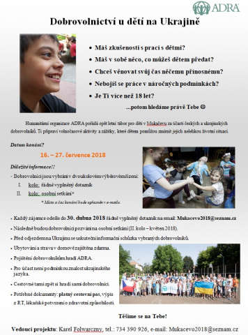 Dobrovolníci z ČR a z Ukrajiny (studující na Mukačevské státní univerzitě) se dětem budou věnovat po celý den a připravovat jim zajímavý program. Stejně jako v předchozích letech se bude jednat o sportovní aktivity, o výtvarné a tvořivé práce, také taneční činnost a jiné. Za tímto účelem pořádáme v Mukačevu seminář pro zájemce o dobrovolnictví v ukrajinských podmínkách, který se bude konat ve dnech 19. - 20. 5. 2018. Seminář povedou lektoři z organizace ADRA v ČR.