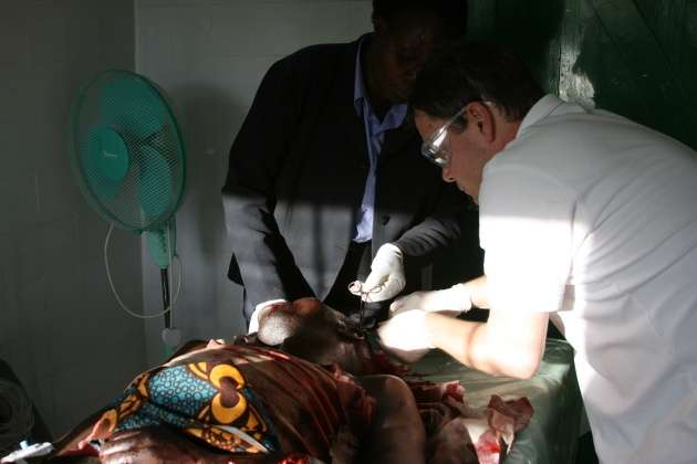 Okolo osmé hodiny večer 23. 1. 2012 slyšíme před bránou troubení motorky. Náš strážný Nelson otevírá a z terasy vidíme, jak přivážejí nějakého „vlajícího“ člověka. Slovo „vlající“ není myšleno nikterak hanlivě, ale takto to opravdu vidíte. (Pozn. pokud vezou na motorce těžce nemocného a nebo člověka v bezvědomí, za řidičem vždy sedí - nebo „vlaje“ - pacient a za ním sedí doprovod, který se rukama pevně drží řidiče. Tím dojde k uchycení a částečné stabilizaci bezvládného pacienta). Míří rovnou před ambulanci. Vidíme, jak vláčejí po podlaze bezvládné tělo celé v krvi. Všichni se okamžitě mobilizujeme a nastupujeme do akce. Nejprve, ještě než zjišťujeme charakter úrazu, si v rychlosti rozdělujeme úlohy a pozice. Jeden tým pacienta svléká a další v rychlosti připravuje infuzi a napichuje žílu, abychom měli zajištěný žilní přístup pro podávání léků a také tekutin, které by měly z části nahradit vykrvácení. Po svlečení vidíme na různých částech těla mnohočetné záseky mačetou, ale co nás trápí, je hluboké bezvědomí a masivní krvácení v ústech. V rychlosti postupně prohlížíme rány a zjišťujeme, že jsou hluboké a některé zasahují až do kosti. Útok vedený na hlavu v ní způsobil tři záseky, další z nich odsekl za uchem kostní hrbol a jiný zase přesekl ucho. Záseky byly vedeny i na ruce, jak se napadený bránil. Pak jsme se dozvěděli, že byl jako zbraň ještě použit nůž, který způsobil hlubokou ránu uvnitř úst pronikající od předních horních zubů až do dutin a možná ještě dále. Pak, z tupého poranění hlavy klackem, byla zřejmě zlomená spodina lební, protože mu z ucha vytékala krev. V průběhu této „revize“ ran jen tak mimochodem prohlásím, že se občas stává, že zraněných je více. Po několika minutách se otevírají dveře do ambulance a skupina místních vleče další zkrvavené tělo ve vážném stavu. V tu chvíli se rozdělujeme na dva týmy a začínáme stejný postup i u druhého pacienta. Jeho zranění jsou hlavně na hlavě, bradě a v ústech má rozsáhlou trhlinu vnitřního horního rtu. Každá skupinka se stará o svého pacienta, jen občas si vypomáháme. Jeden tým pracuje na chirurgickém sálku a druhý na lůžku na ambulanci. Stále se otvírají dveře a neustále k nám proudí skupinky lidí, kteří se přicházejí dívat, co se děje a co děláme. Na nějaké vysvětlování není čas, jsme plně vytíženi prací. Naši afričtí zdravotníci po chvíli dochází a s udiveným výrazem se snaží v nastalé situaci orientovat. Pak jen kroutí hlavou nad brutalitou, s jakou byl útok vedený. Všude po zemi jsou loužičky krve a občas nás i nějaká artérie zkropí přes oděv. Na hlavě druhého pacienta se po chvíli daří podvázat přetnuté tepénky a tím zamezujeme vytváření loužiček krve pod pacientem. Pokračujeme v zašívání ran. První pacient je na tom podstatně hůře, a tak každý z našich studentů, který je volný, šije. Pak se soustřeďíme na rozsáhlou ránu v ústech, která neustále krvácí. Jakmile se odstraní tamponáda, pacient znovu „bublá“. Začínáme v rychlosti revidovat ránu a následně ji zašívat, abychom zamezili ztrátě krve. Pacient ale přestává dýchat a tak jej rychle intubujeme, napojujeme na ambu-vac, kyslík a dýcháme s ním. Současně odsáváme spoustu krve nosem i ústy.
