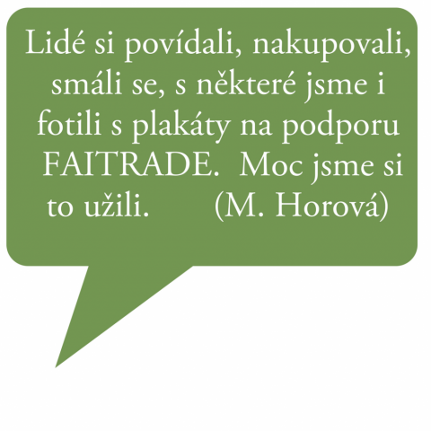 Byli jsme svědky, že i tentokrát se spolupráce s dalšími aktéry ve městě vyplatila – paní starostka u sousedního stolu prodávala fairtradové výrobky obchůdku Jeden svět, pan farář místní Českobratrské církve evangelické vyhlašoval program a zároveň pozval trubače Consonare, kteří zahájili prodej fairtradové kavárny krátkým koncertem. Díky tomu mezi účastníky celé akce nechyběli ani náhodní kolemjdoucí, kteří mohli nasát kouzlo domácí atmosféry. Více si můžete přečíst na stránkách školy, fotografie si můžete projít v galerii níže.