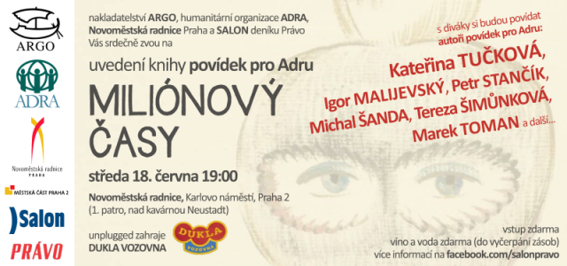 Srdečně vás zveme na křest souboru povídek pro Adru Miliónový časy, který začne ve středu 18. června od 19.hodin na Novoměstské radnici v Praze 2, Karlovo náměstí. S diváky si budou povídat autoři povídek pro Adru Kateřina Tučková, Igor Malijevský, Petr Stančík, Michal Šanda, Tereza Šimůnková, Marek Toman a další autoři.